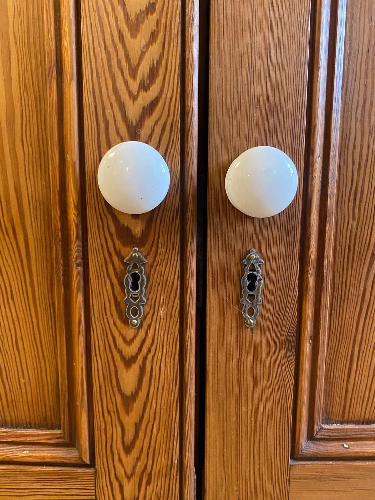 A handsome and practical late nineteenth century sideboard.  Crafted in beautifully figured pitch pine, the panelled doors display striking natural grain patterns, enhanced by a warm honeyed patina developed over time. A moulded top sits above a simple frieze with carved corbels, adding subtle architectural detail to the otherwise clean lines. The two cupboard doors each retaining their original porcelain knobs, open to reveal a shelved interior with a solid central division, offering useful storage within a neat footprint. Raised on a plinth base, the piece has a grounded, sturdy presence while remaining versatile in scale. A charming and functional example of Victorian pine furniture, full of warmth and character.