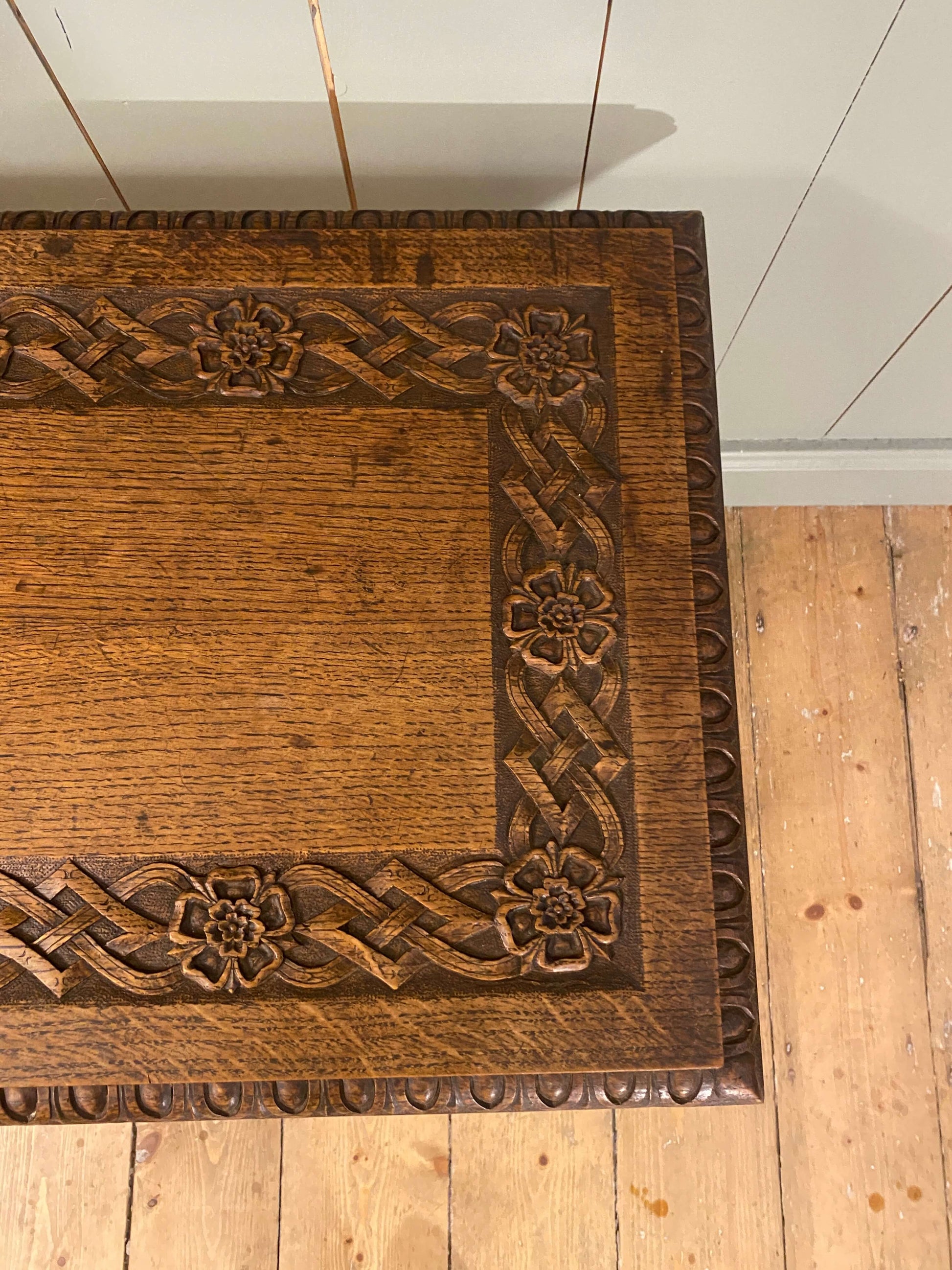 Beautiful Arts and Crafts carved oak side table. A lovely piece with an intricate, hand carved border along the table top, featuring Celtic knot and foliate motifs. This wonderfully crafted occasional table is as practical as is striking, be it for plants, lamps, or as a side table in any room.