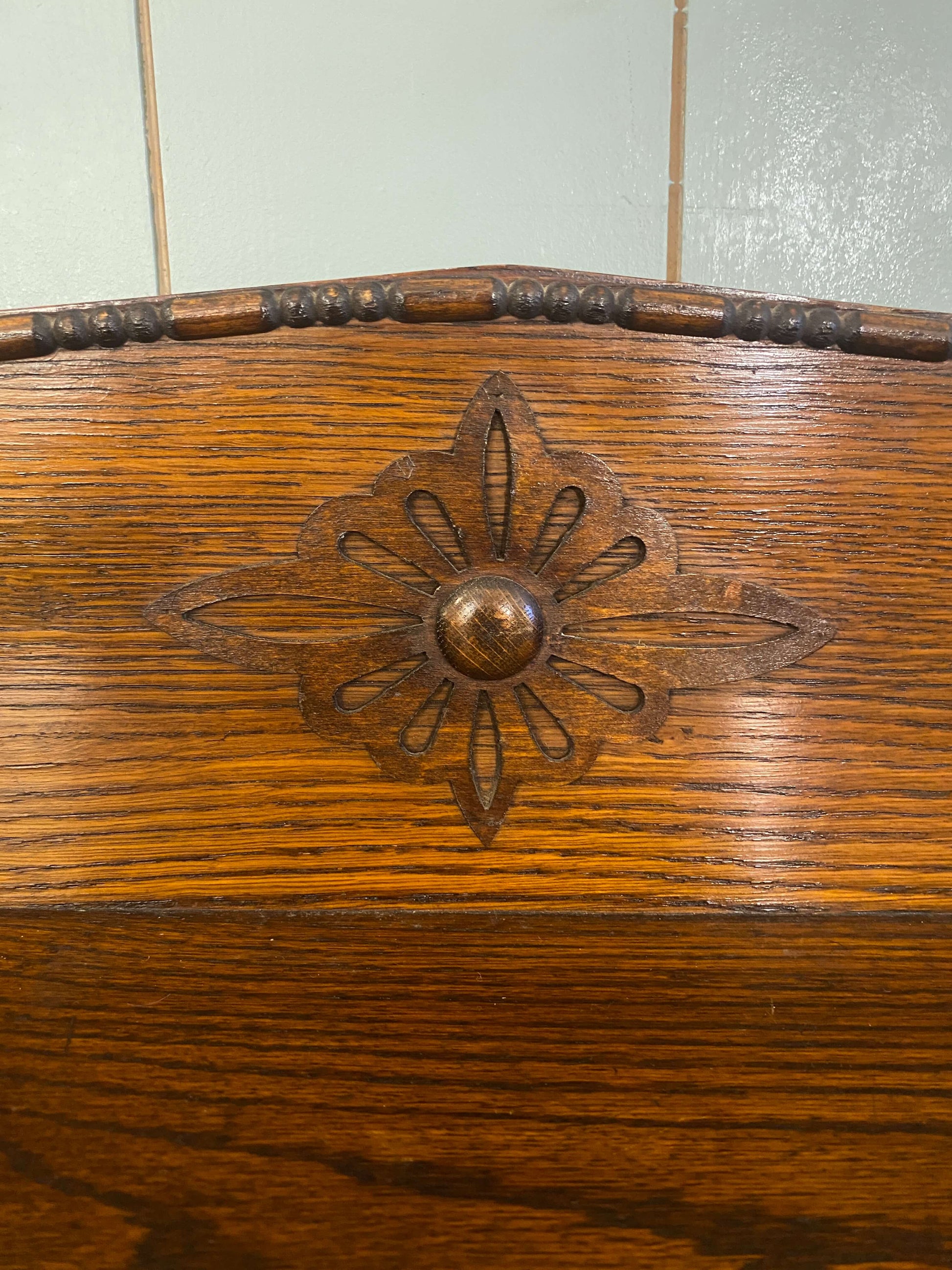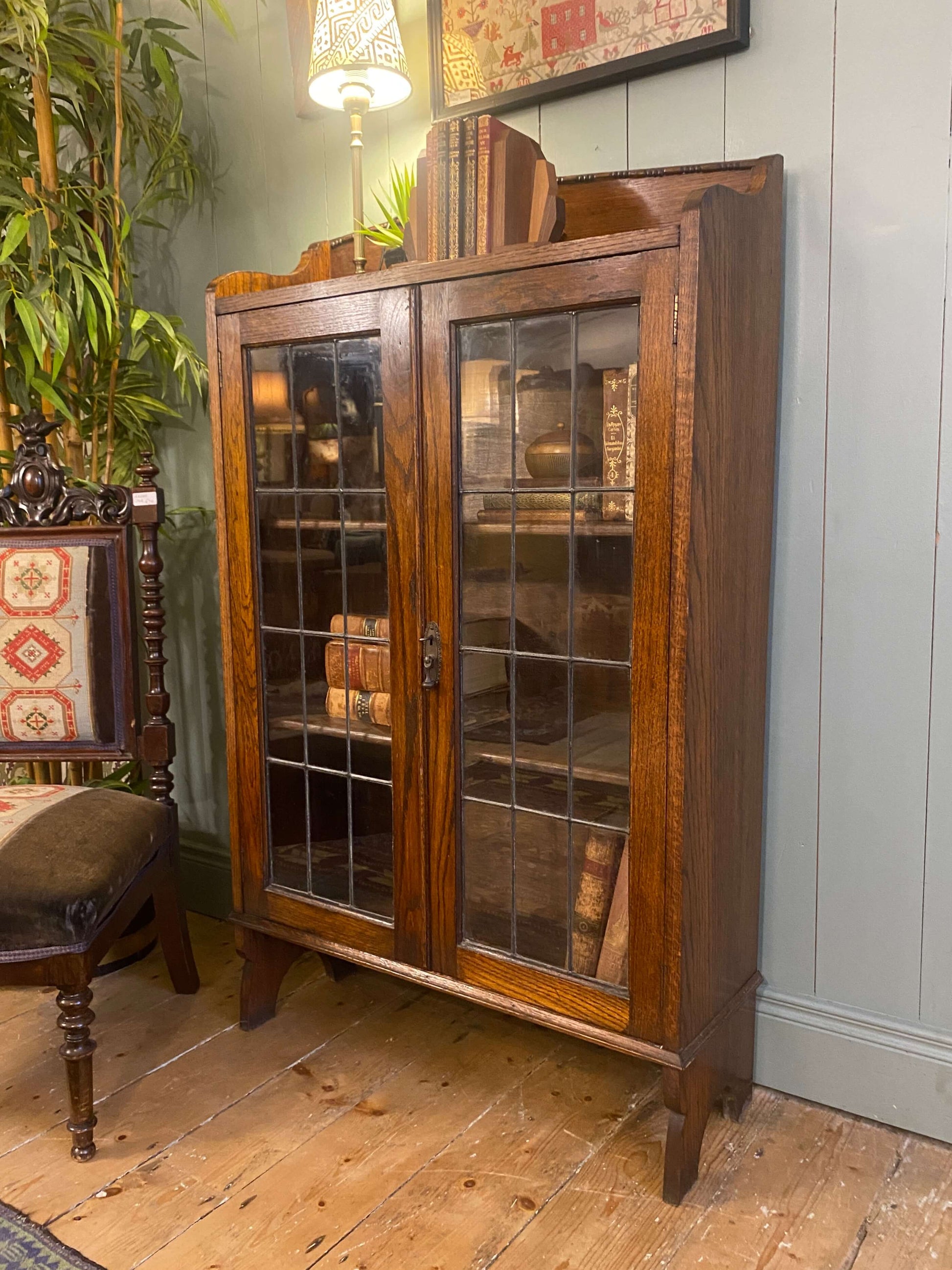 Gorgeous Arts and Crafts oak glazed bookcase of slender proportions. Features lovely carved detail to its gallery back above two leaded glazed doors housing adjustable shelving on the interior. A beautiful piece displaying great warmth and character.