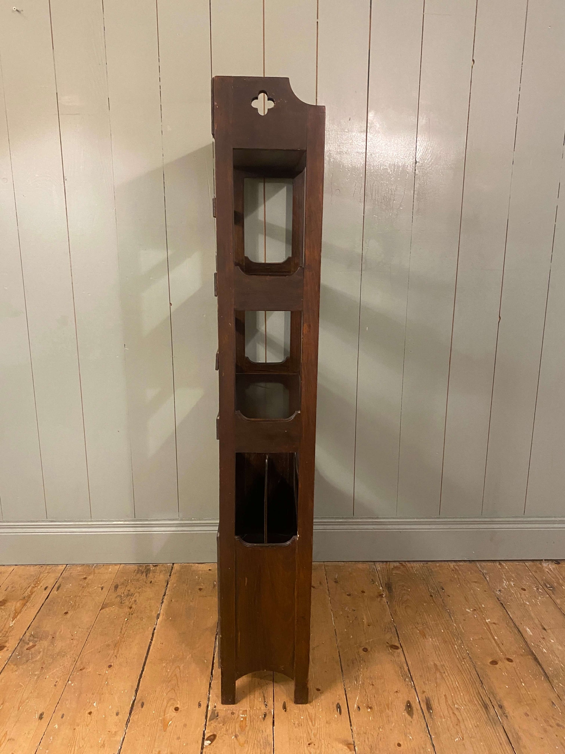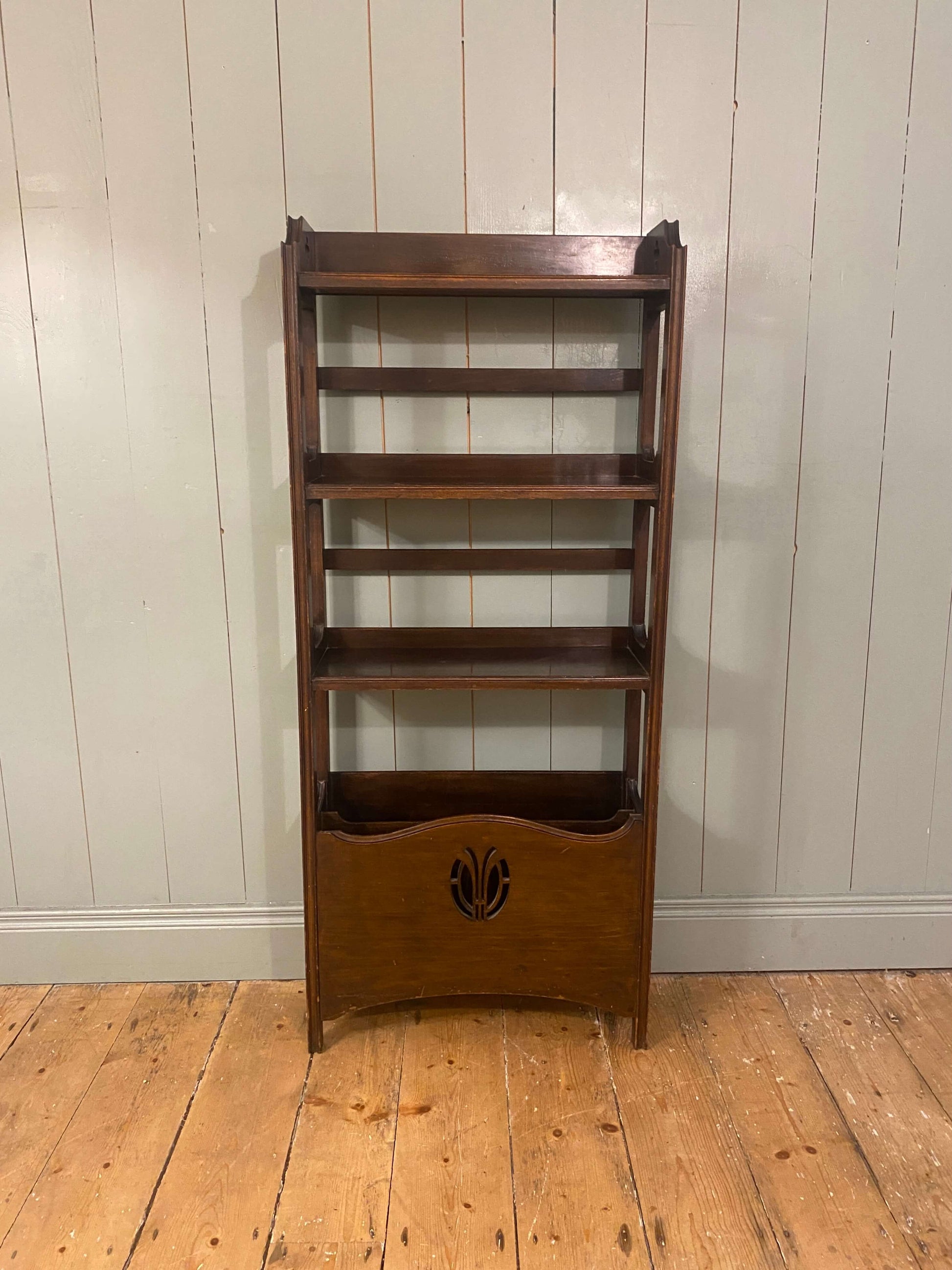 Arts and Crafts slim open bookcase of neat proportions crafted in rich oak. A tall open-shelf design with a lower enclosed section for magazines or records. Lovely clean lines on this piece featuring cut out motifs. Elegant, characterful and practical, this is ideal for a tidy spot in just about any room.