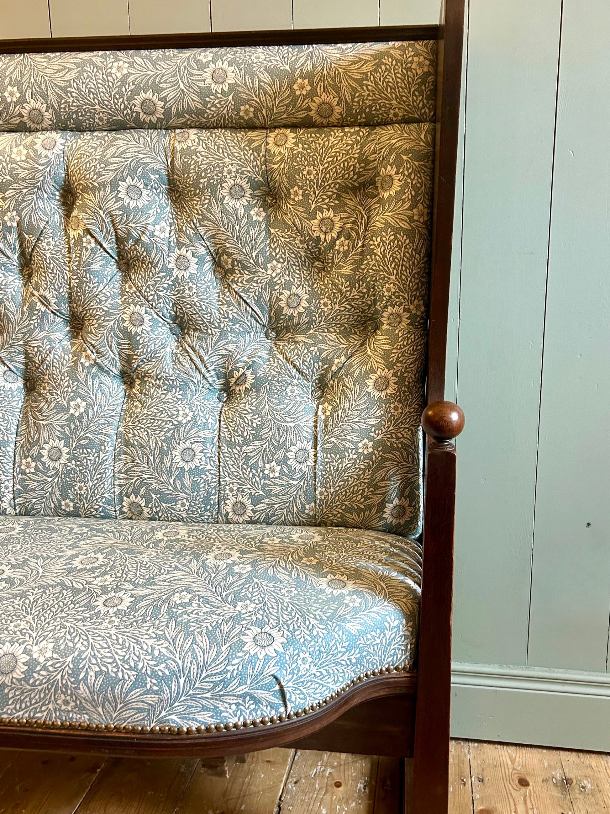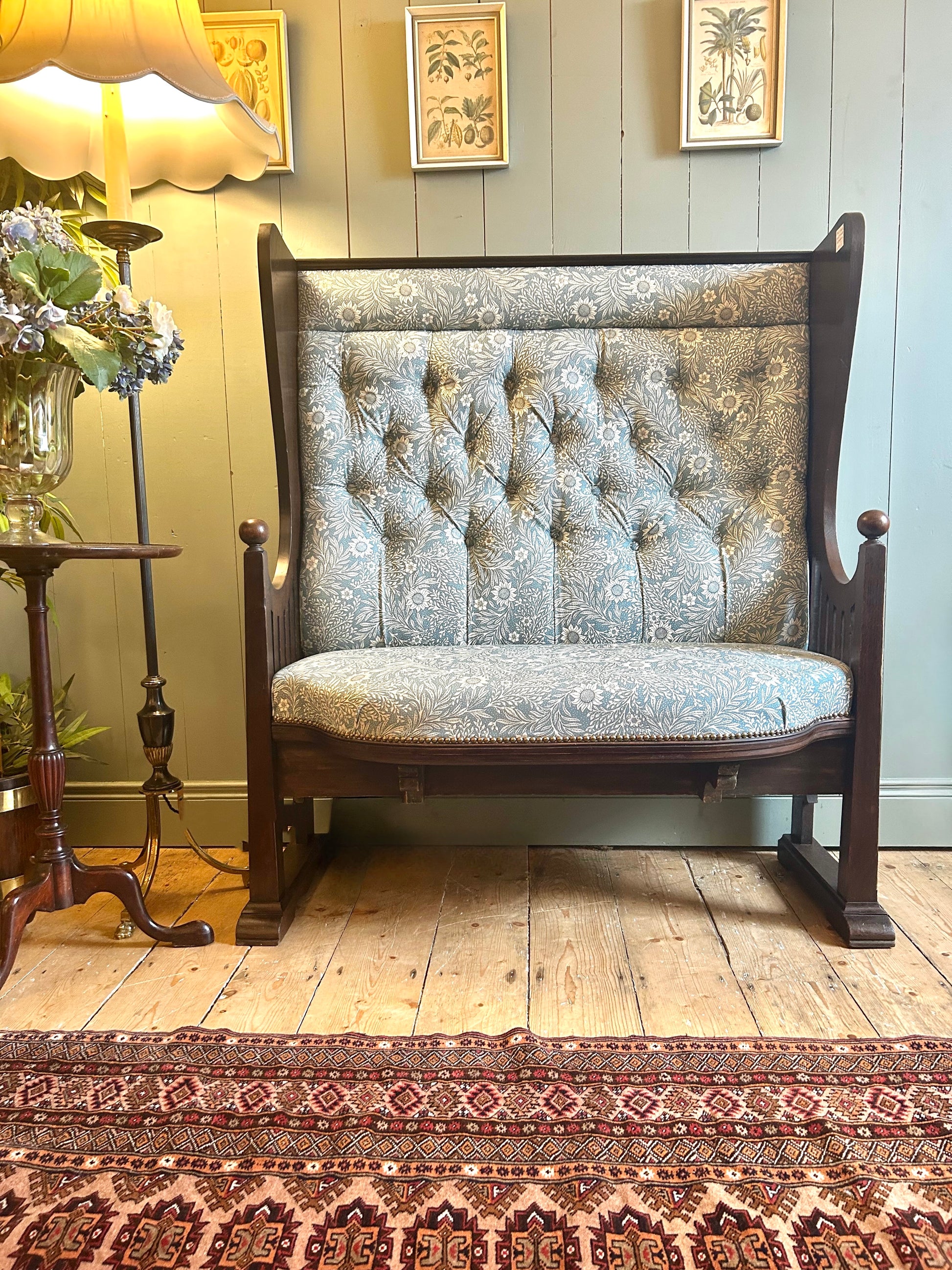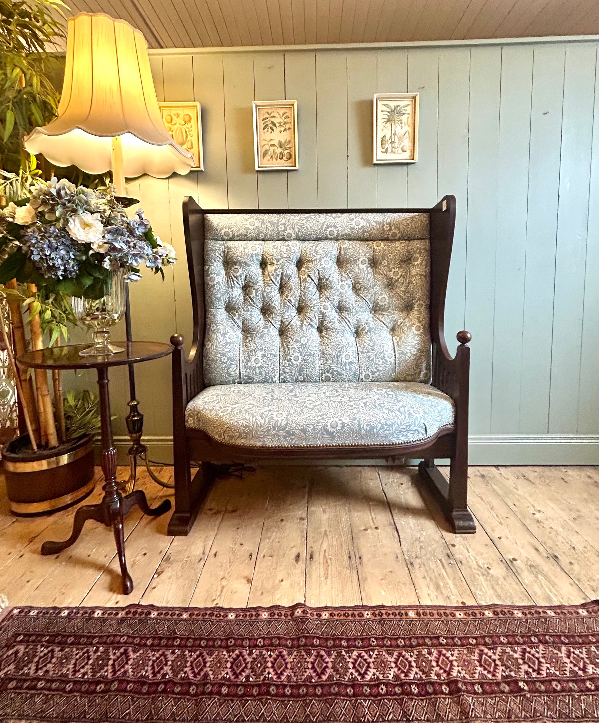 A rare and utterly charming Arts & Crafts high-back settle has just landed in the shop.  With its sculptural curved wings, turned finials, and beautifully button-tufted seat, this piece brings both presence and comfort. Newly upholstered in a classic William Morris-style floral print, it feels timeless yet fresh — the sort of seat that invites you to pause, settle in, and exhale.  Perfect for a hallway, reading nook, or anywhere that deserves a touch of character.