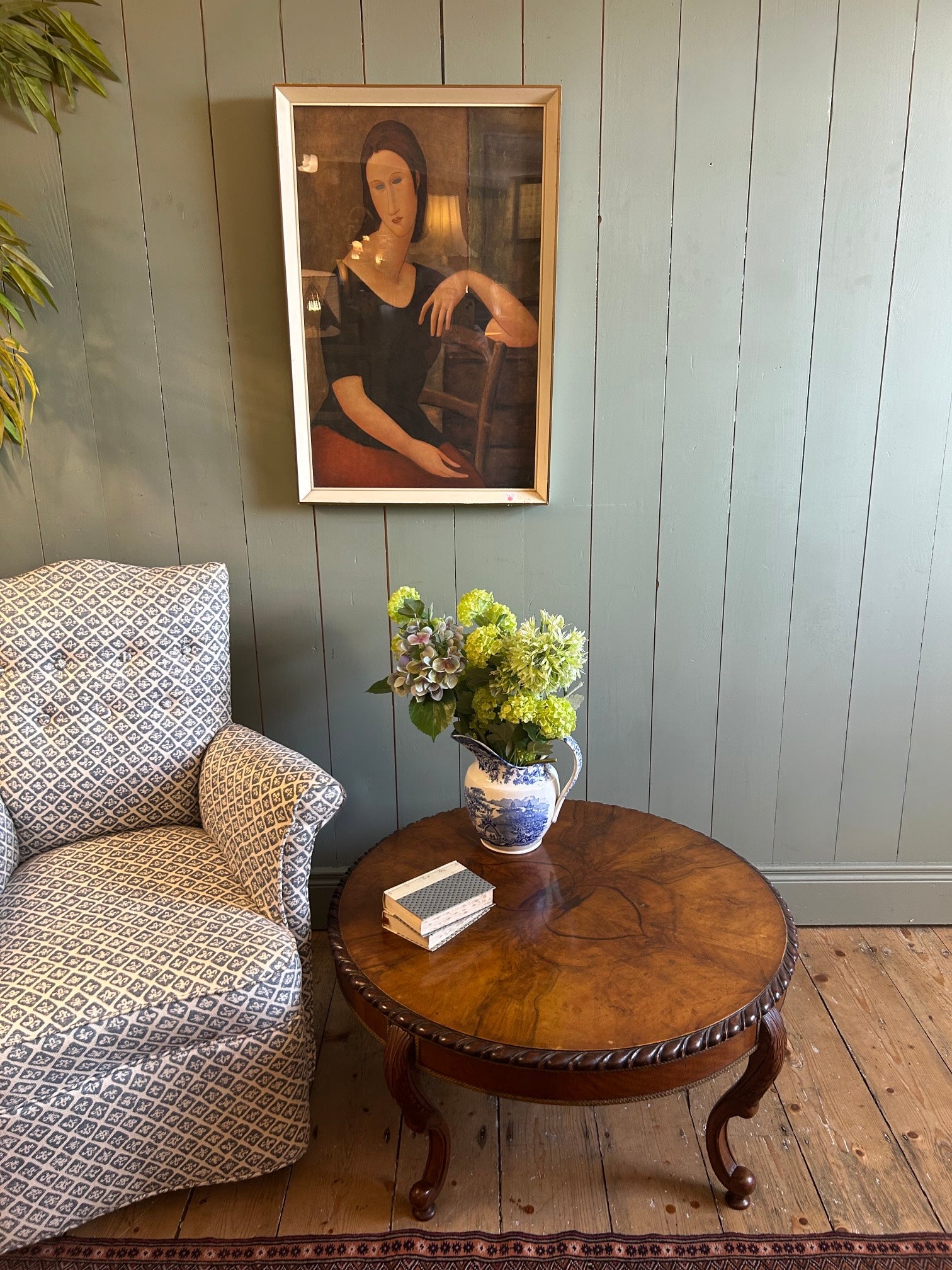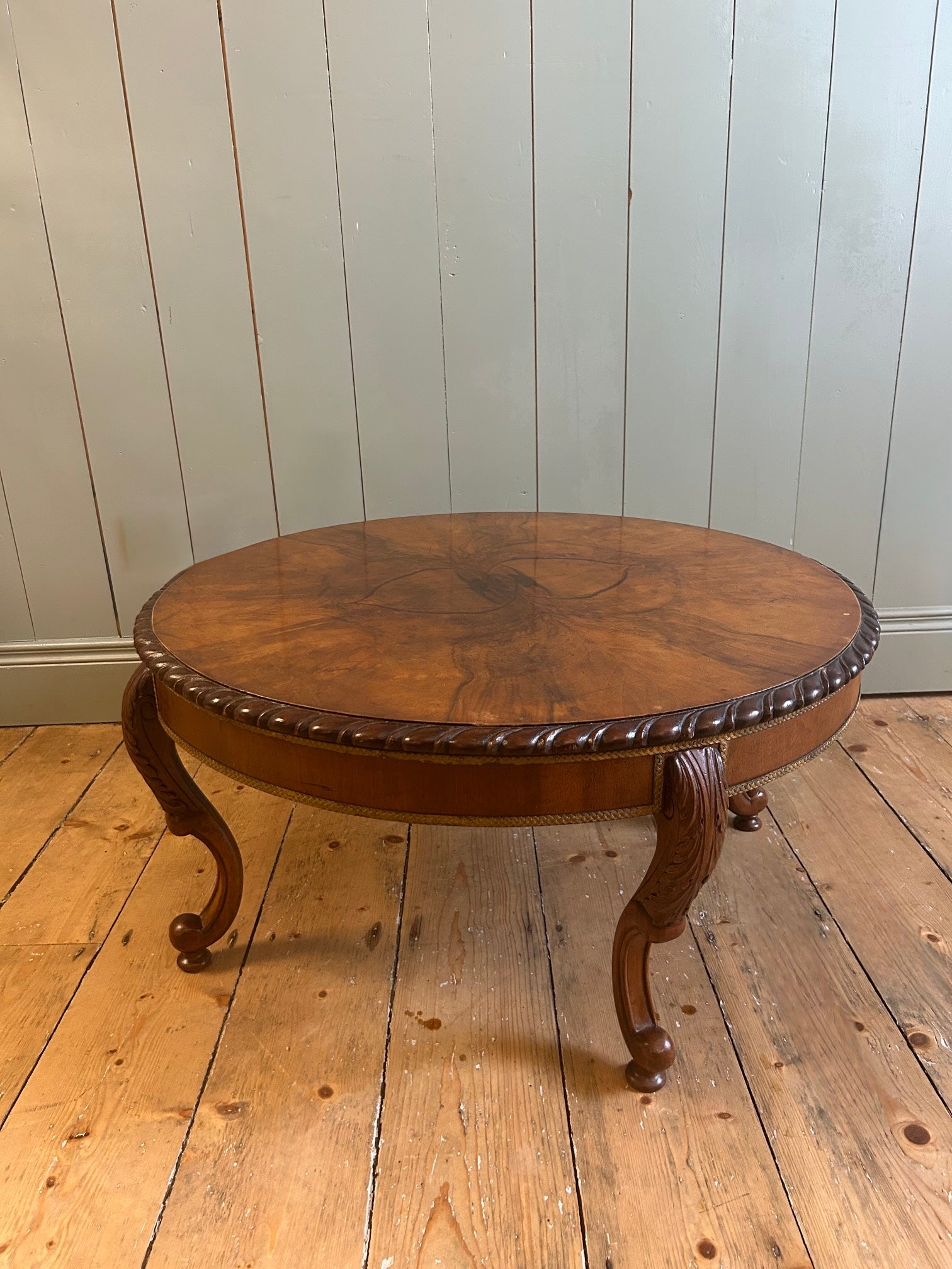 An Edwardian solid walnut coffee table in the Queen Anne style with cabriole legs. The top is beautifully figured with dramatic walnut grain radiating from the centre, creating a rich, swirling pattern full of warmth and character. The edge is finished with a finely carved gadrooned border, adding depth and definition.