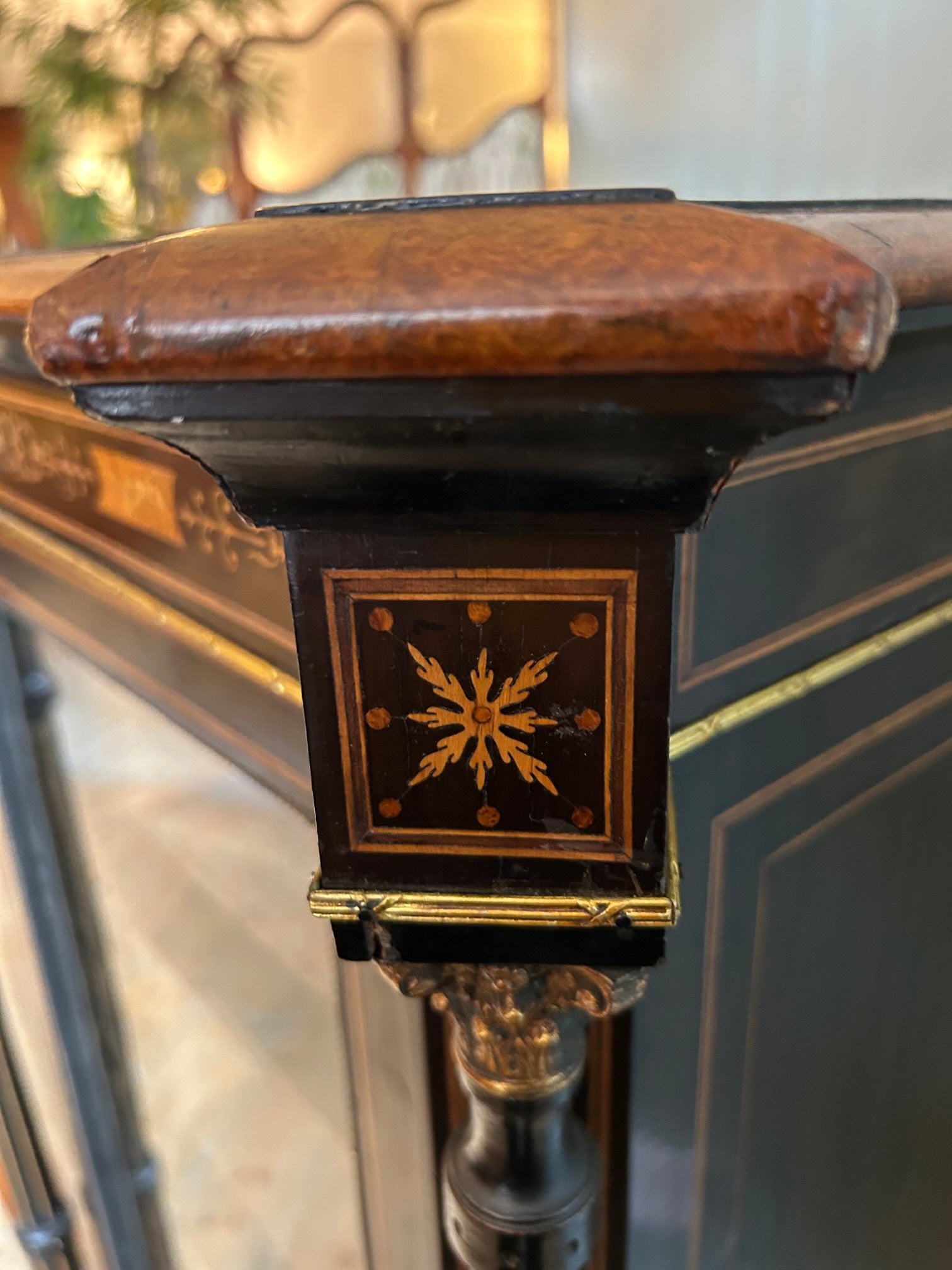 An exquisite mid-19th Century Victorian credenza of superb quality, richly ebonised and beautifully inlaid with intricate marquetry and gilt detailing.  It was made by Hewetson & Thexton, with a site at 204 Tottenham Court Road between 1839 and 1910 who were considered some of the finest cabinet makers of the day. The inside of the central door has their plaque.