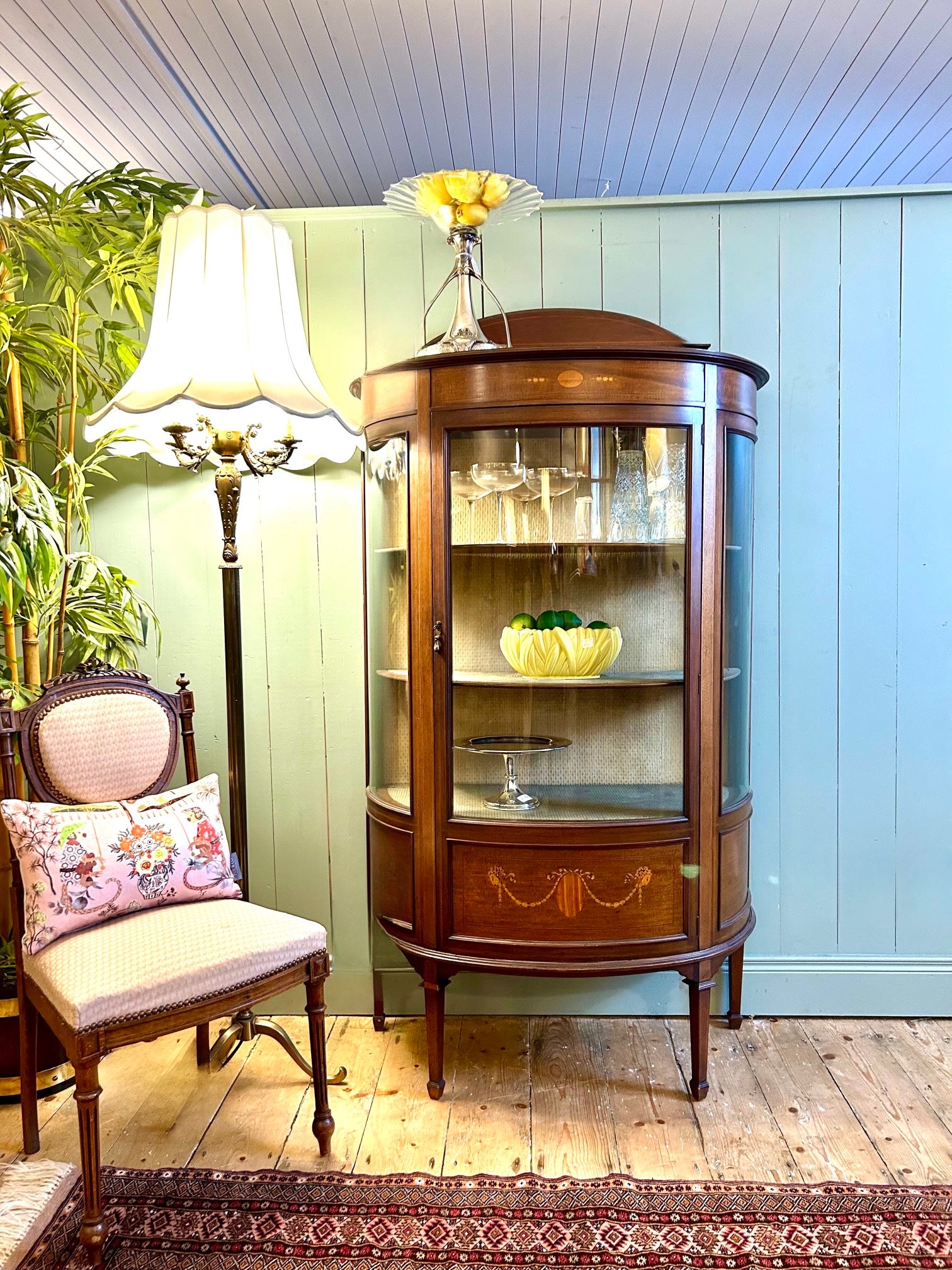 A beautifully elegant Edwardian mahogany display cabinet featuring delicate satinwood inlay and refined neoclassical motifs.  The bow fronted design showcases curved glass side panels and a single glazed door opening to three fitted display shelves for presenting your treasured glassware or ceramics.