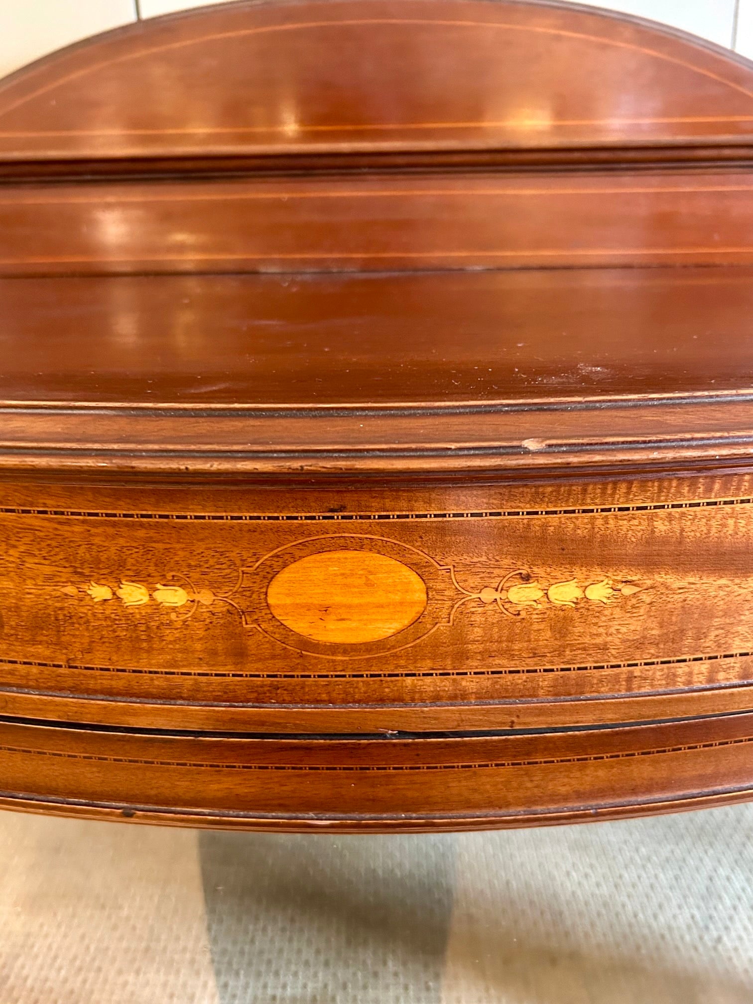 The interior retains its original silk lining and the lower panel display displays exquisite marquetry with ribbon and swag decoration.  Raised on slender tapering legs with spade feet, this piece conbines elegance and restraint typical of the Edwardian era.