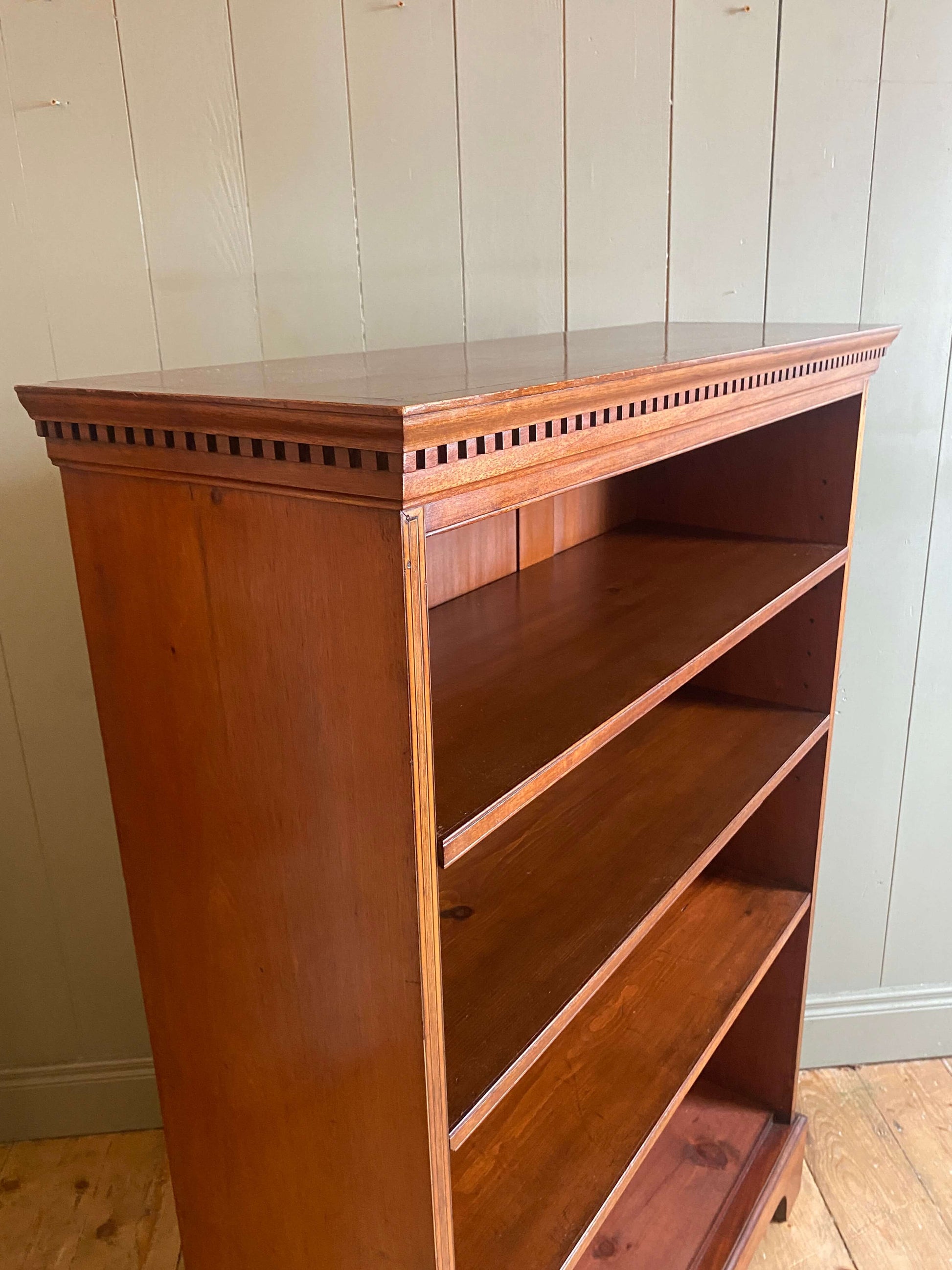 Stunning Edwardian mahogany open bookcase with a carved dentil cornice and inlaid detail down the front sides. A most handsome piece and a fabulous addition to just about any room, from sitting room to study, bedroom or hallway.