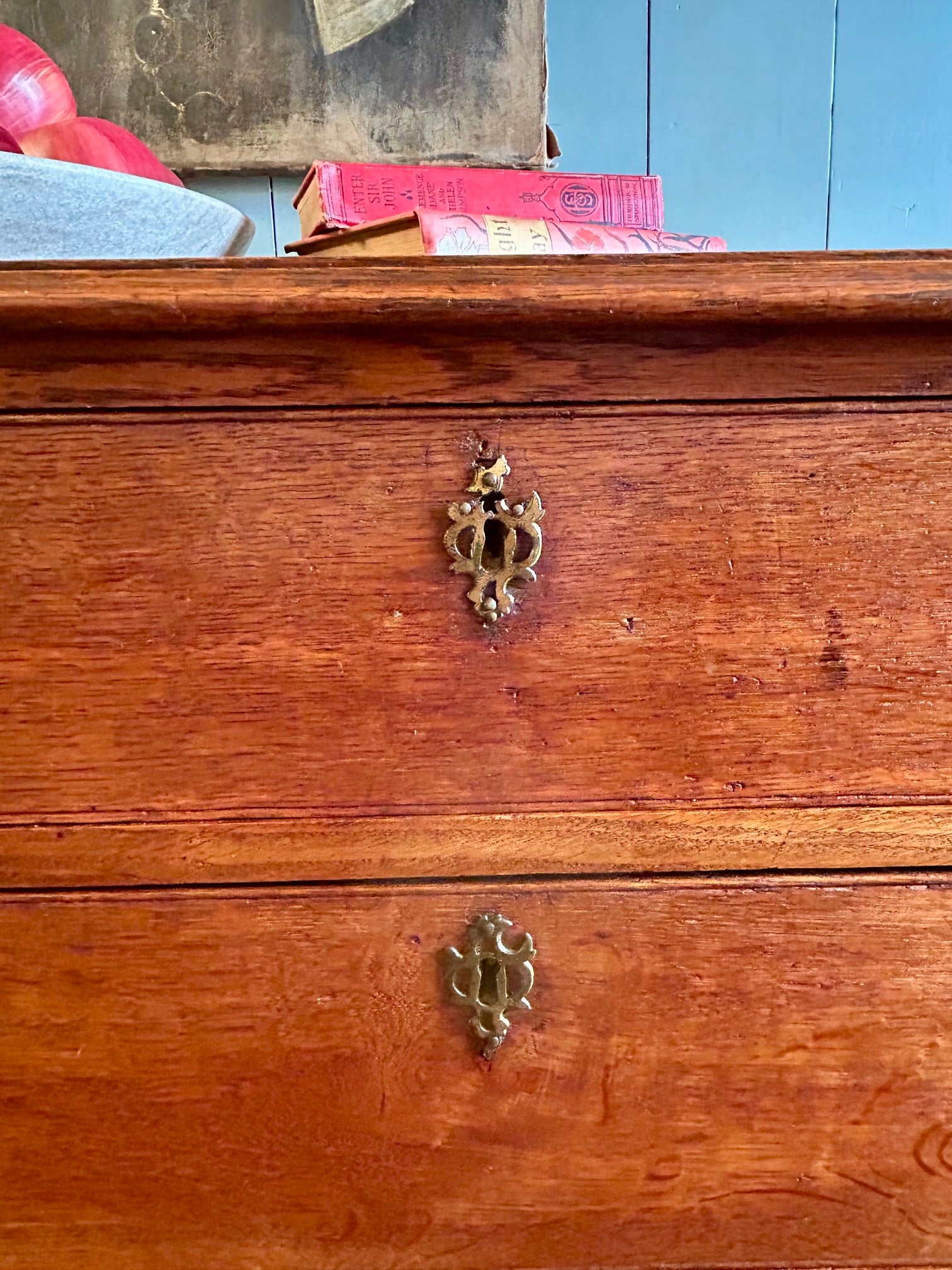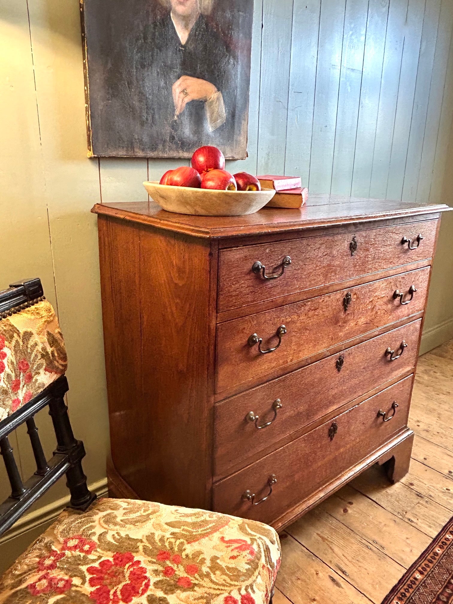 A solid late 18th century oak chest of drawers with four graduated drawers, original brass swan-neck handles and decorative escutcheons.  The piece stands on traditional bracket feet and has a beautifully warm patina, developed over more than two centuries of use.  The proportions are elegant yet practical and the craftsmanship is solid and honest, characteristic of Georgian country furniture.  A versatile and timeless chest of drawers adding charm and function to any interior.