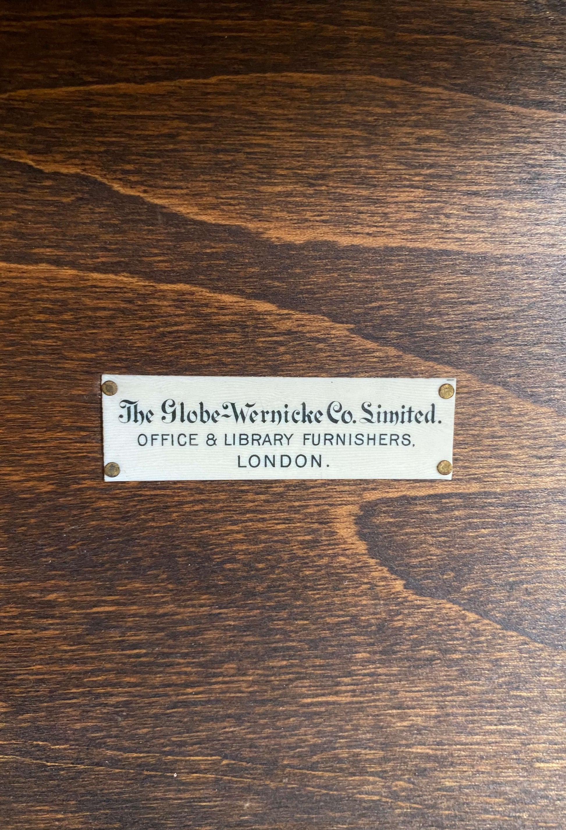 Stunning Globe Wernicke sectional stacking bookcase c1920's with four up and over glazed doors. Made of mahogany, shaped top over four shelf units, each with glazed door and brass knob handle, original makers label to each shelf. In excellent condition with doors in good working order. A most handsome and fully functional piece and a wonderful addition to a study, sitting room or office.