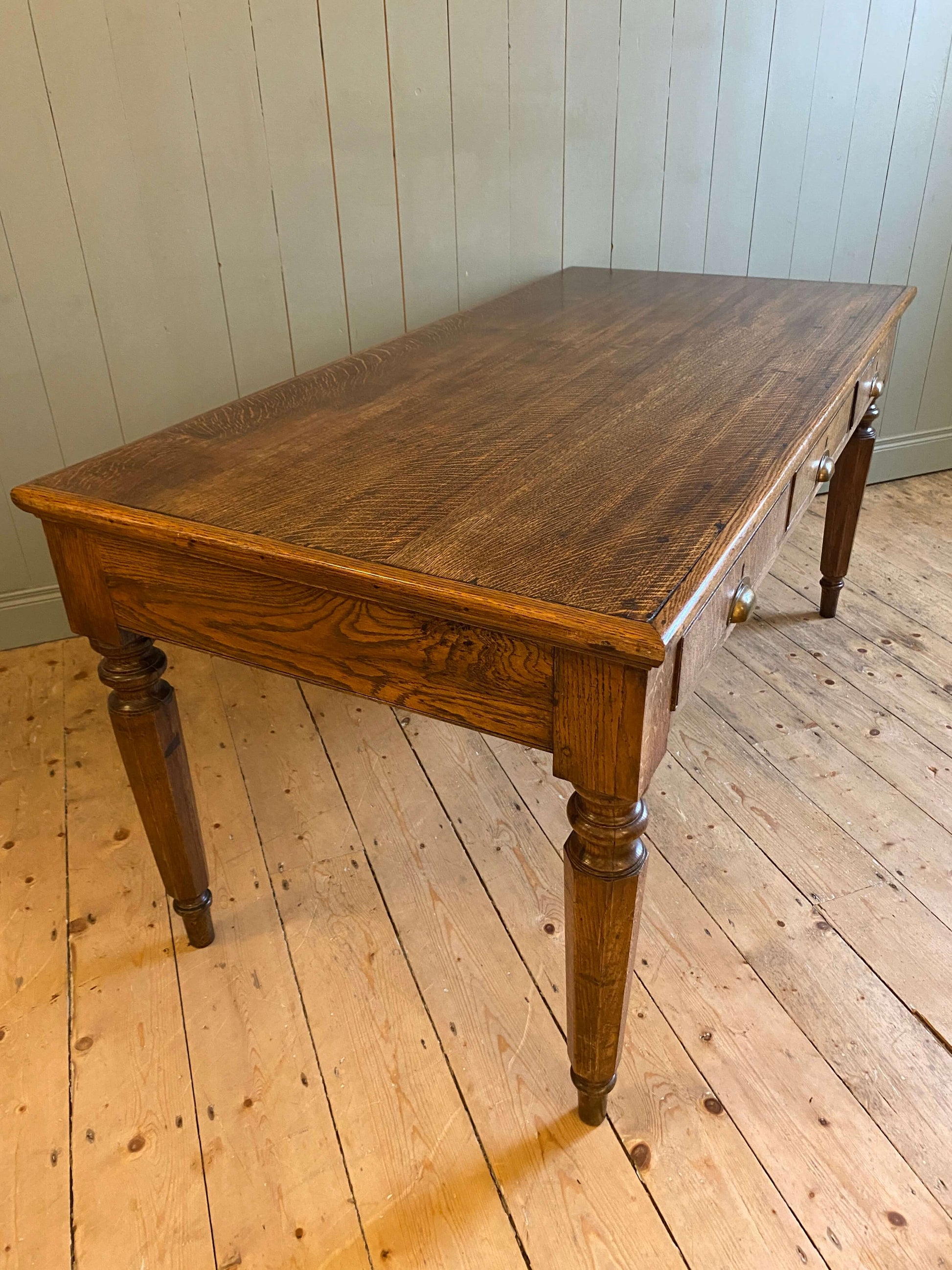 Striking Victorian oak partners desk of great proportions. Contains six drawers with brass cup handles, three front and three back, so a beauty from all angles! This stands on magnificent turned and octagonal carved legs and has beautiful grain throughout. A most handsome piece with great presence and character. This would also make a fabulous kitchen/dining table.
