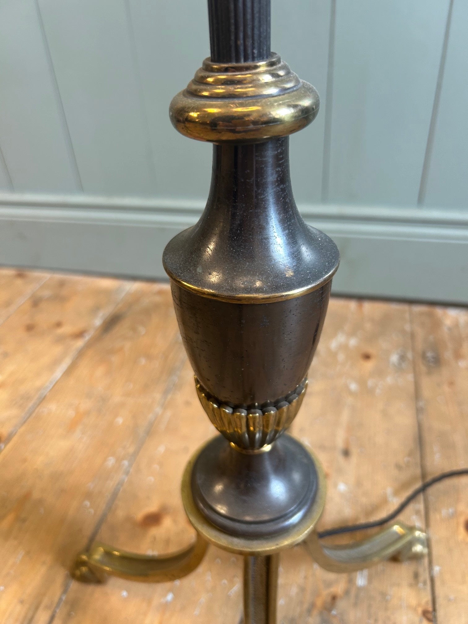 A wonderfully elegant pair of Brass floor or standard lamps from the late Victorian / Edwardian era with a keen Arts and Crafts sensibility.  With handsome, slender columns and tripod bases, they offer a pleasing balance and proportion.  Each lamp is topped with a softly flared, scalloped ivory fabric shade with a balloon interior which casts a warm, ambient glow when lit.