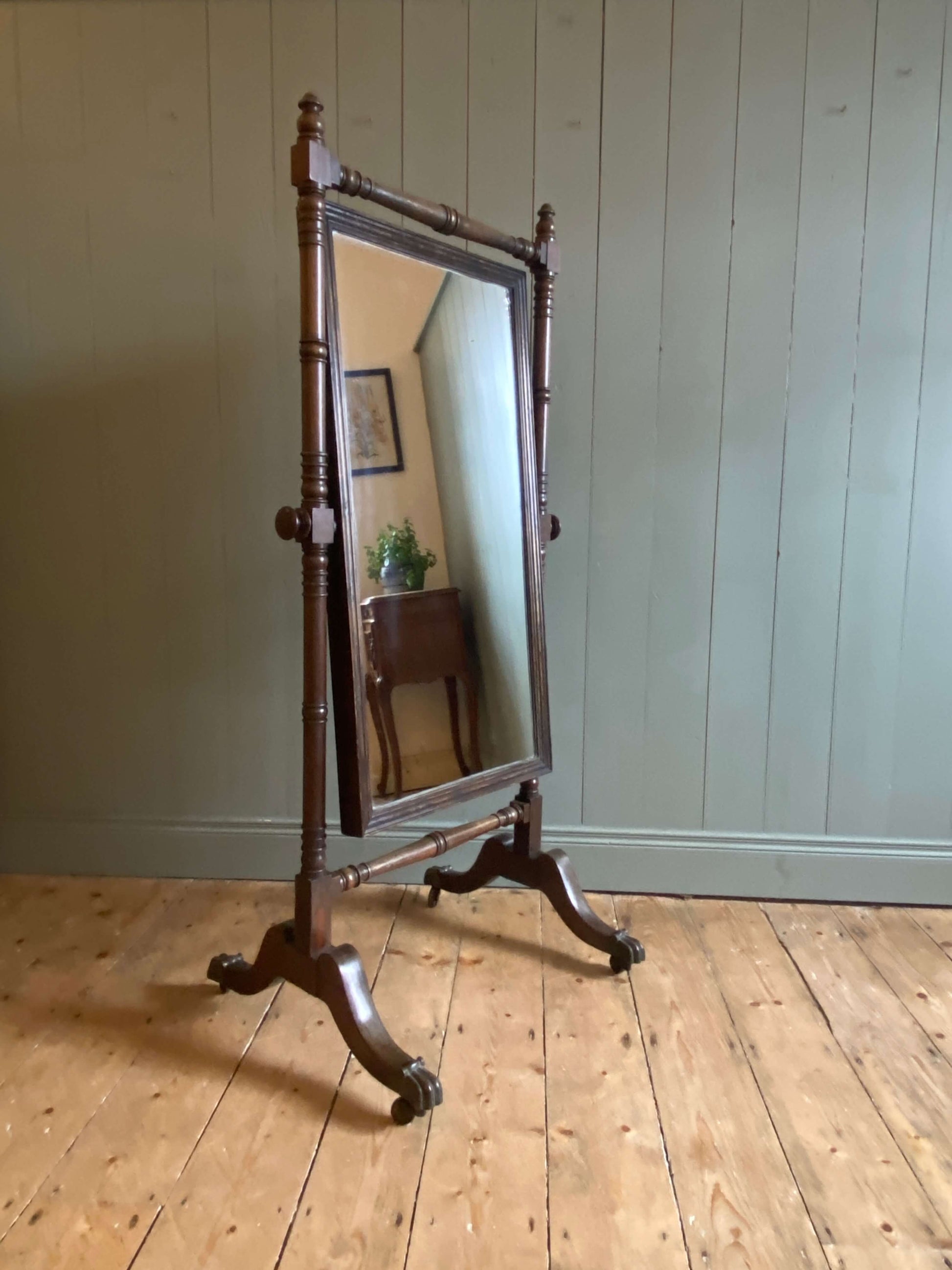Regency cheval mirror with claw feet. An elegant piece with framed glass between ring turned supports and a stretcher, raised on hip splayed legs with lion claw brass castors. A beautiful, stylish piece for a bedroom or bathroom.