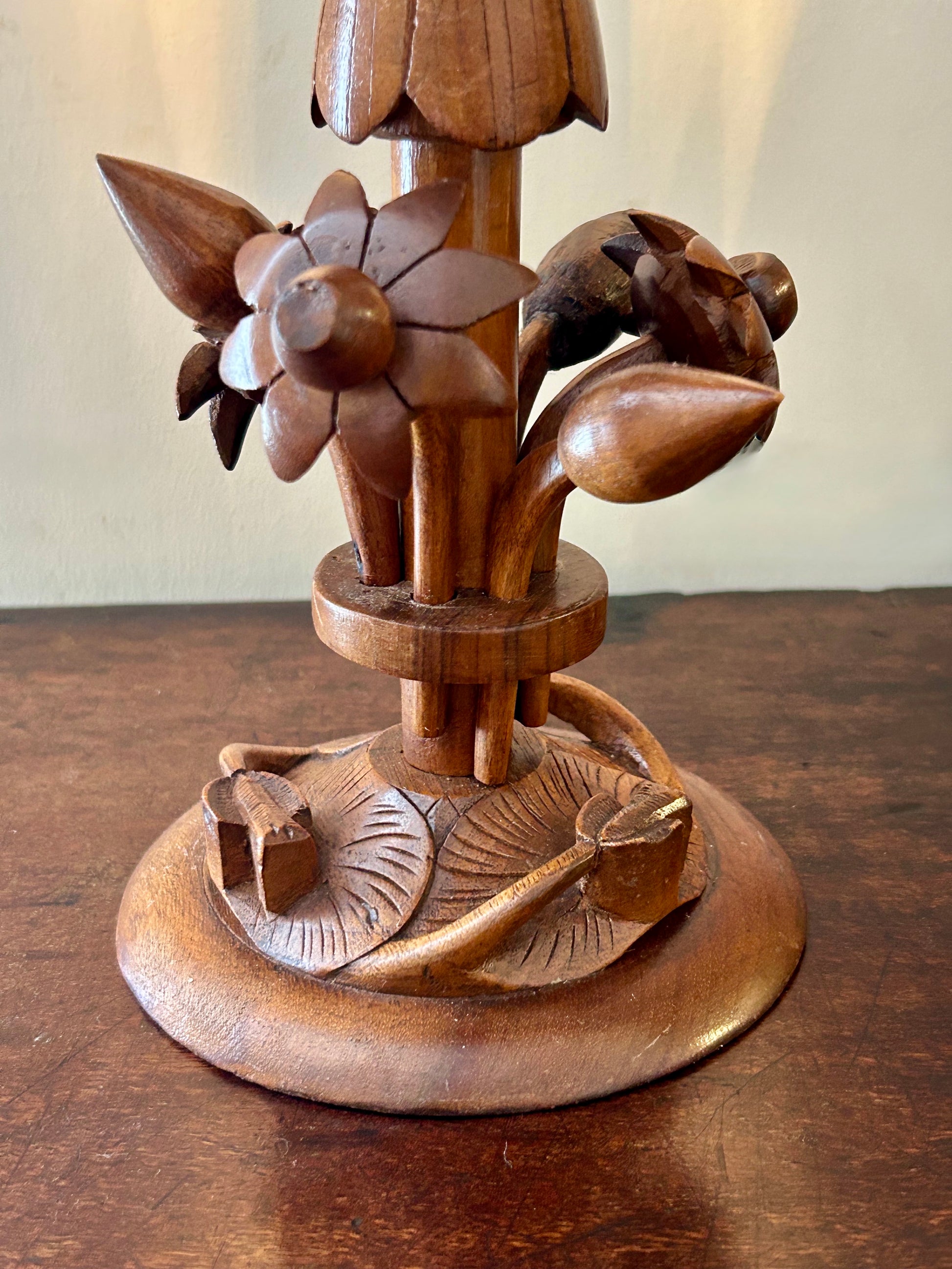 A beautifully hand-carved solid teak table lamp in the form of a blooming lotus flower.  The crafting skill is exceptional, with intricate detailing of petals, leaves and smaller blossoms surrounding the central stem.  The upper section opens out like a flower in bloom, revealing the bulb inside and casting warm, organic light patterns on the wall.  This lamp is both sculptural and functional - a striking piece of Swedish design from c.1950s.