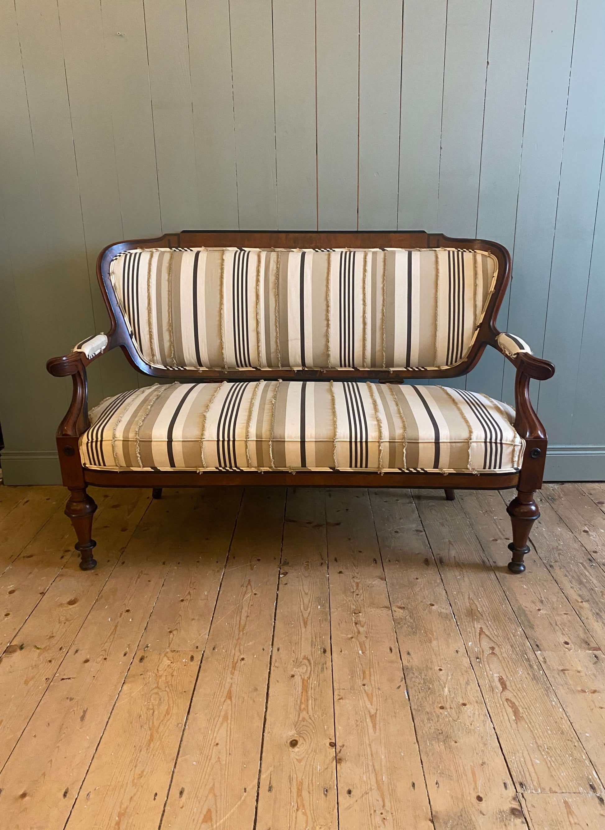 Exquisite Victorian 3-seater walnut settee c1870. This elegant beauty is quite the stunner with its fabulous rich walnut frame, turned front legs and wonderful carved detail. Upholstered in smart striped fabric and in great condition. This special piece would certainly add style and sophistication to a living space.