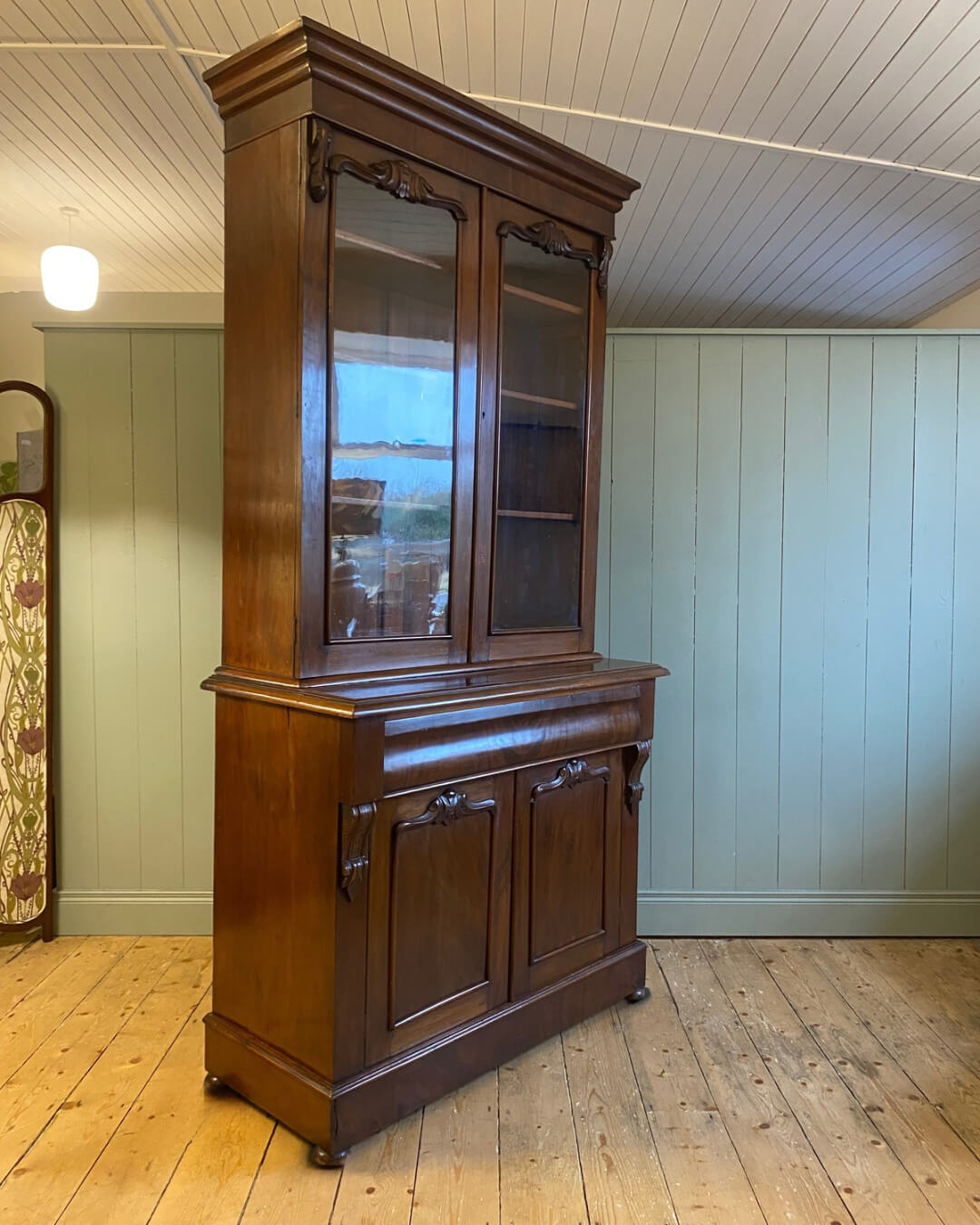 Absolutely stunning Victorian mahogany glazed bookcase with striking carved detail. Features a shaped cornice on the top section over twin glazed doors, with adjustable shelving inside. Beneath this a frieze drawer over a cupboard base with solid panelled doors. Ample storage space inside with different compartments and a deep drawer with original brass drop handle. This rests on bun feet. An outstanding piece in figured mahogany with beautiful grain patterns. A wonderful addition to a sitting room, study or office.