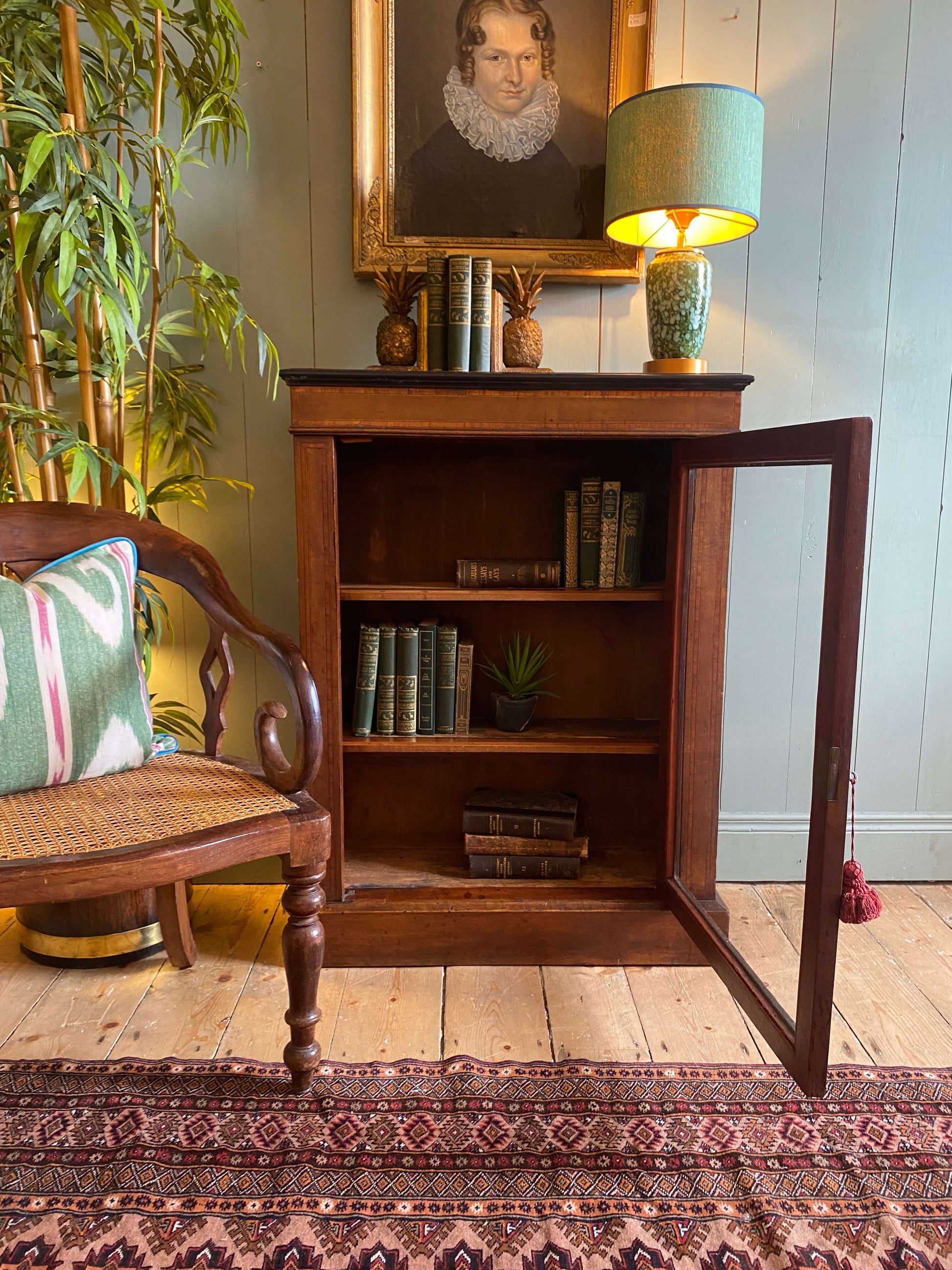 Beautiful Victorian inlaid mahogany pier cabinet c1880. A lovely piece in warm mahogany with inlaid detail throughout sitting on a plinth base. The glazed door encloses two shelves and included its original key and functioning lock. A stylish piece for storing books, glassware, drinks or collectibles.