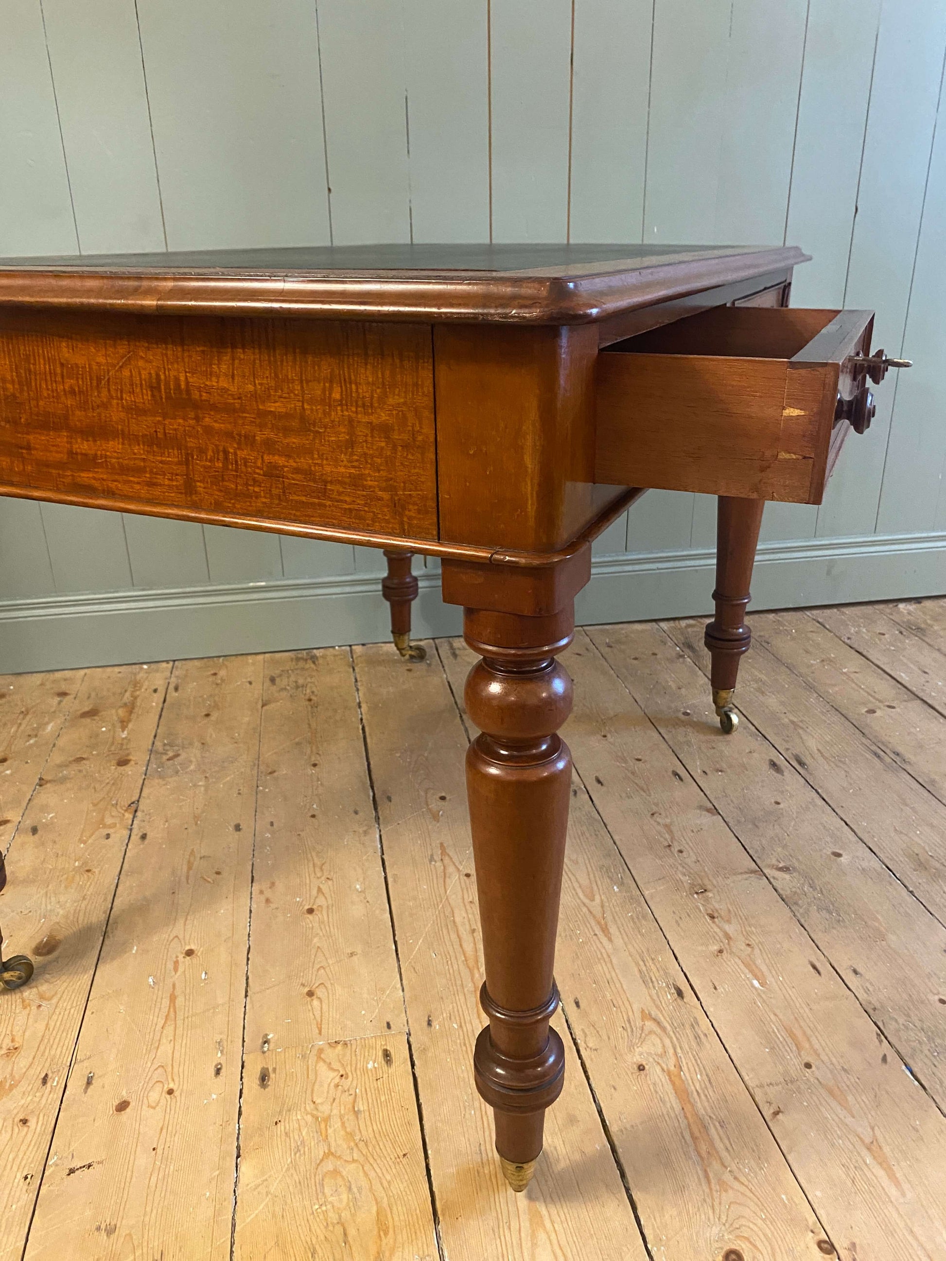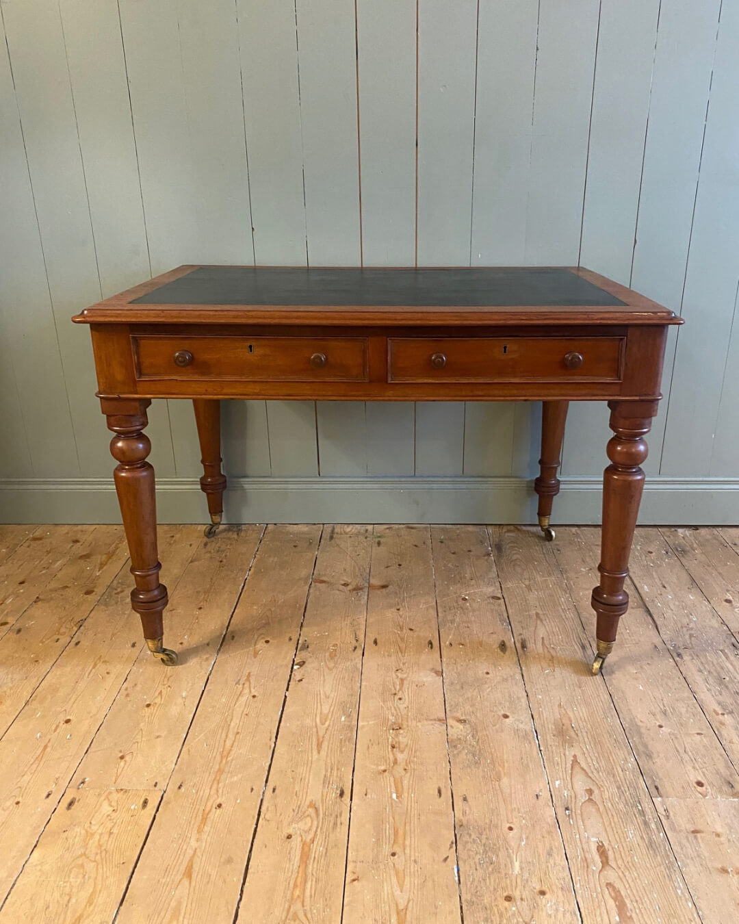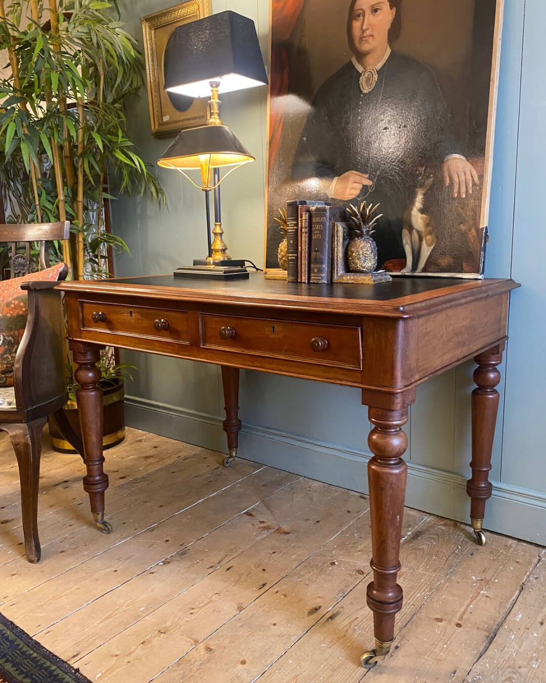 Stunning Victorian leather top writing desk in rich mahogany with lovely patina. A striking piece of craftsmanship with pristine green leather top. Features a moulded top over two short drawers and stands on wonderful turned legs with brass castors. A fabulous addition to a sitting room, study or office.