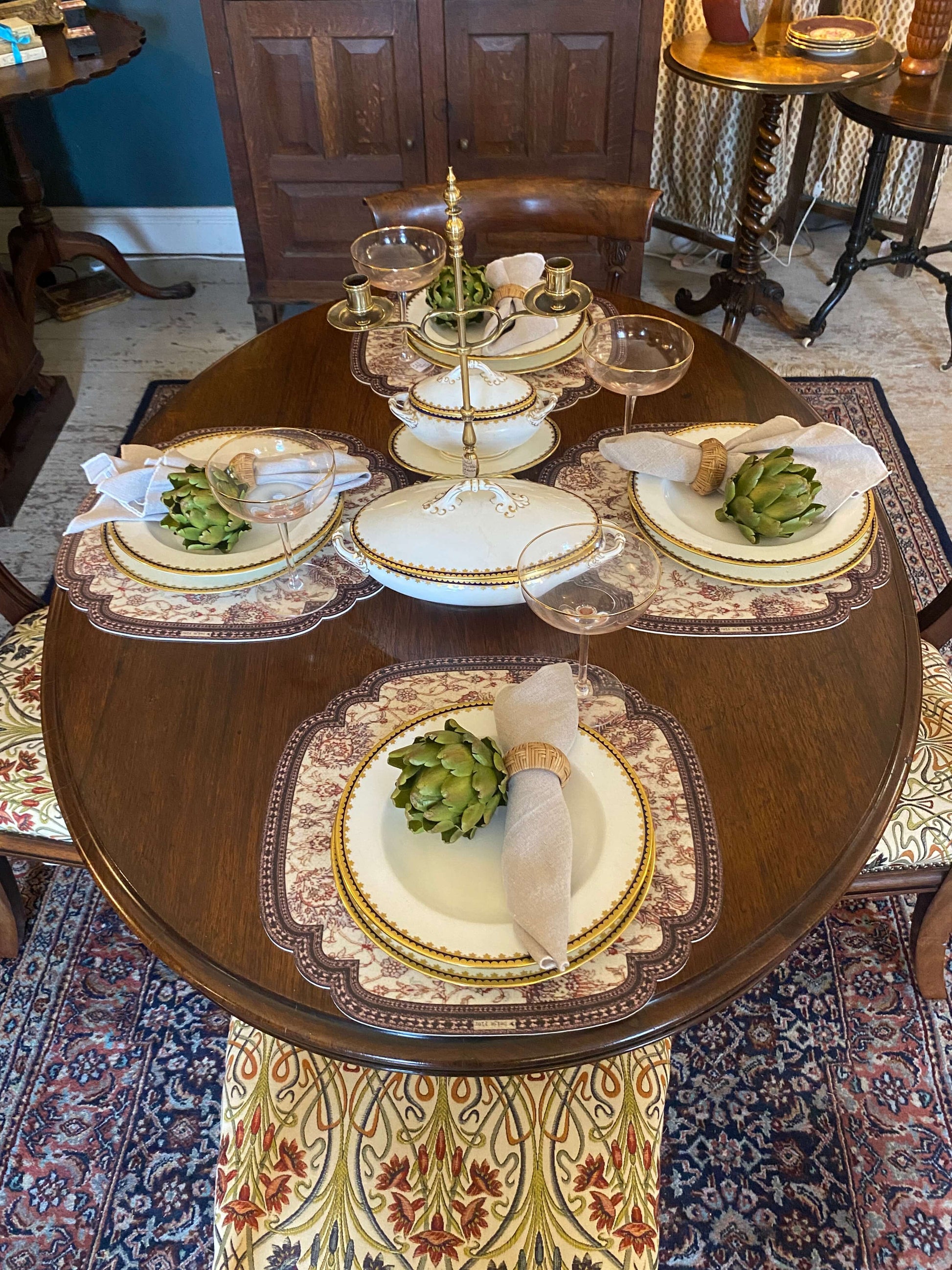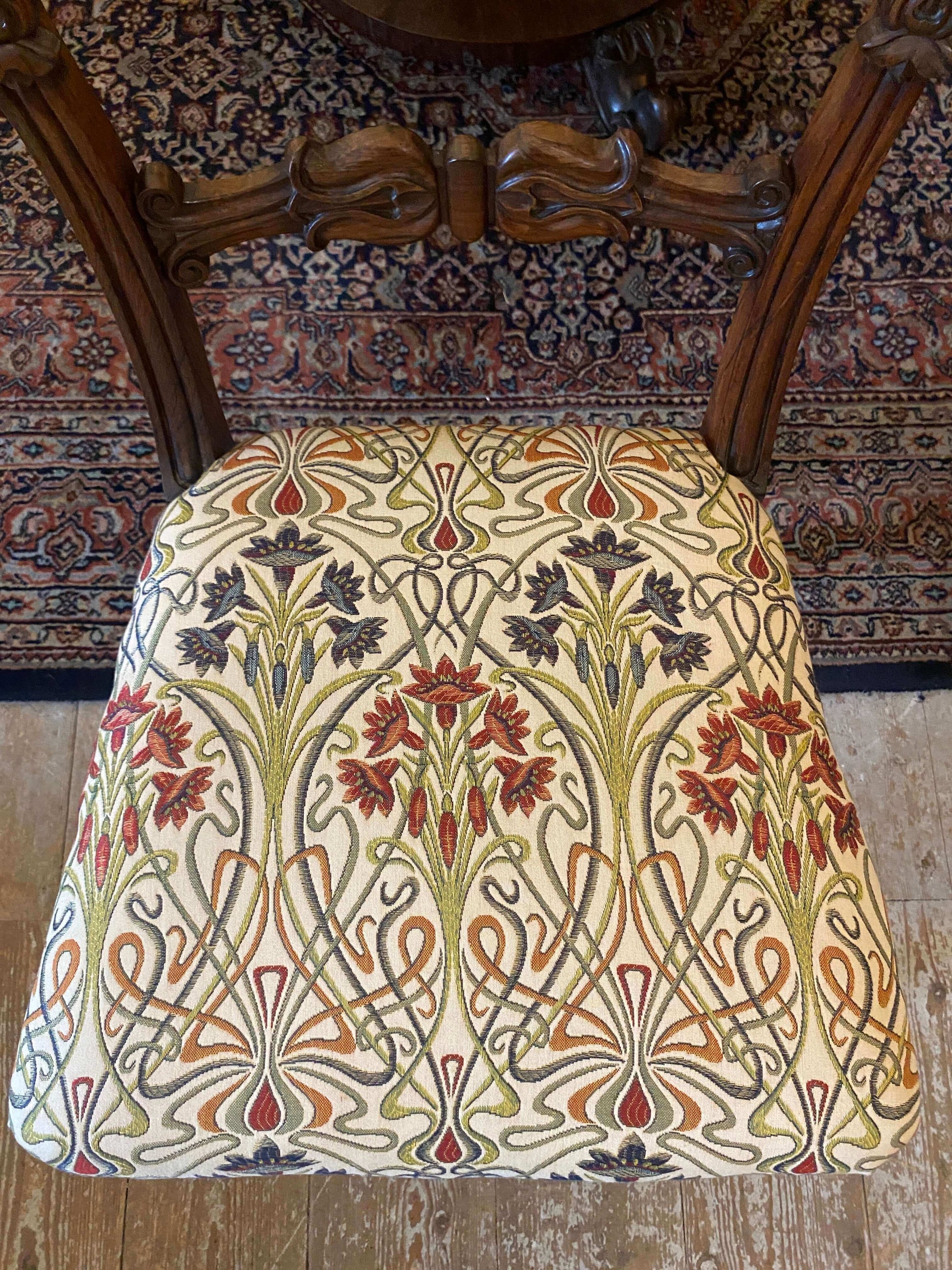This is paired with a set of 4 Victorian mahogany dining chairs. They’ve fabulous carved detail to the backs with turned reeded front legs and are upholstered in gorgeous Tiffany Jewel upholstery. They sit on original brass castors.